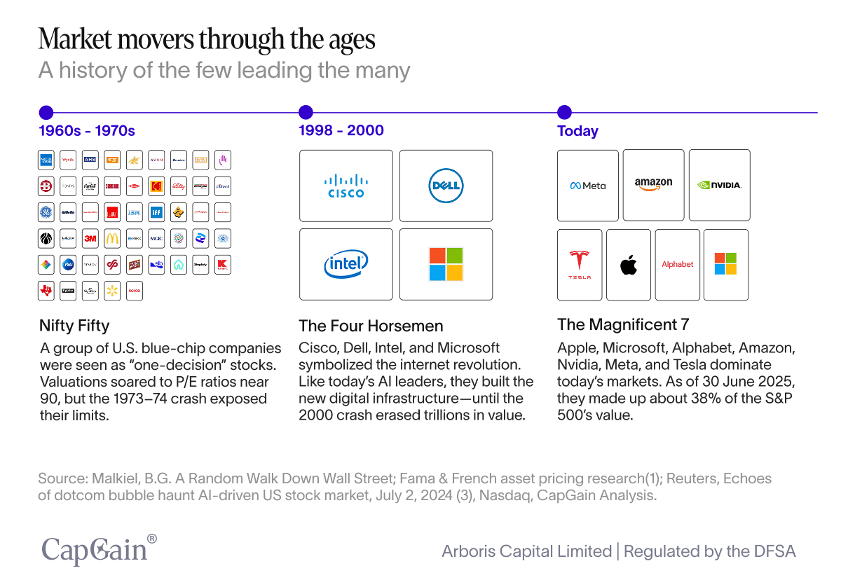 This is not the first time this has happened. In the lead up to the dot-com bubble, the four horsemen – Cisco, Dell, Intel, and Microsoft – dominated the market index. And in the late 60s and 70s it was… The Nifty Fifty.