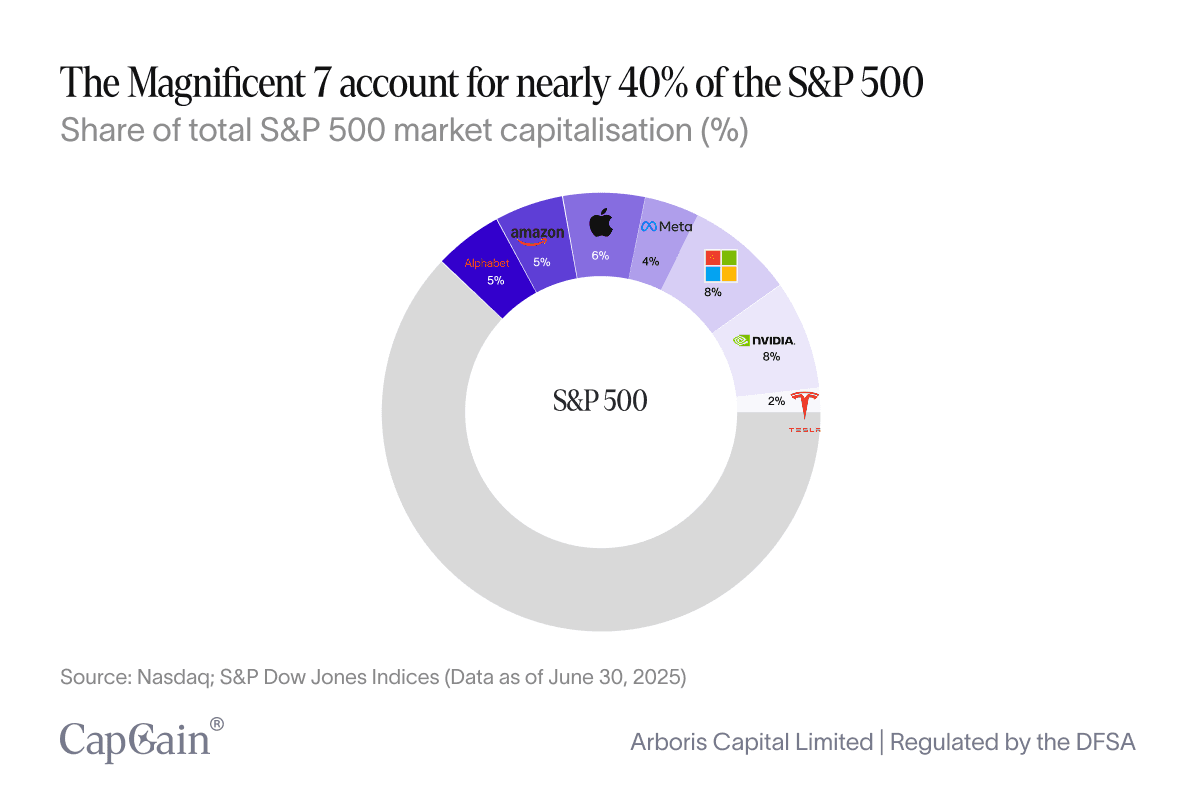 Analysis based on market capitalisation data retrieved from Nasdaq.com for Nvidia, Meta Platforms, Tesla, Apple, Alphabet, Microsoft, and Amazon, as of June 30, 2025. Market cap figures reflect publicly available data accessed individually from each company's listing page on Nasdaq. “Magnificent 7” weighting calculated as the group’s combined market capitalisation divided by the total S&P 500 market capitalisation on that date.