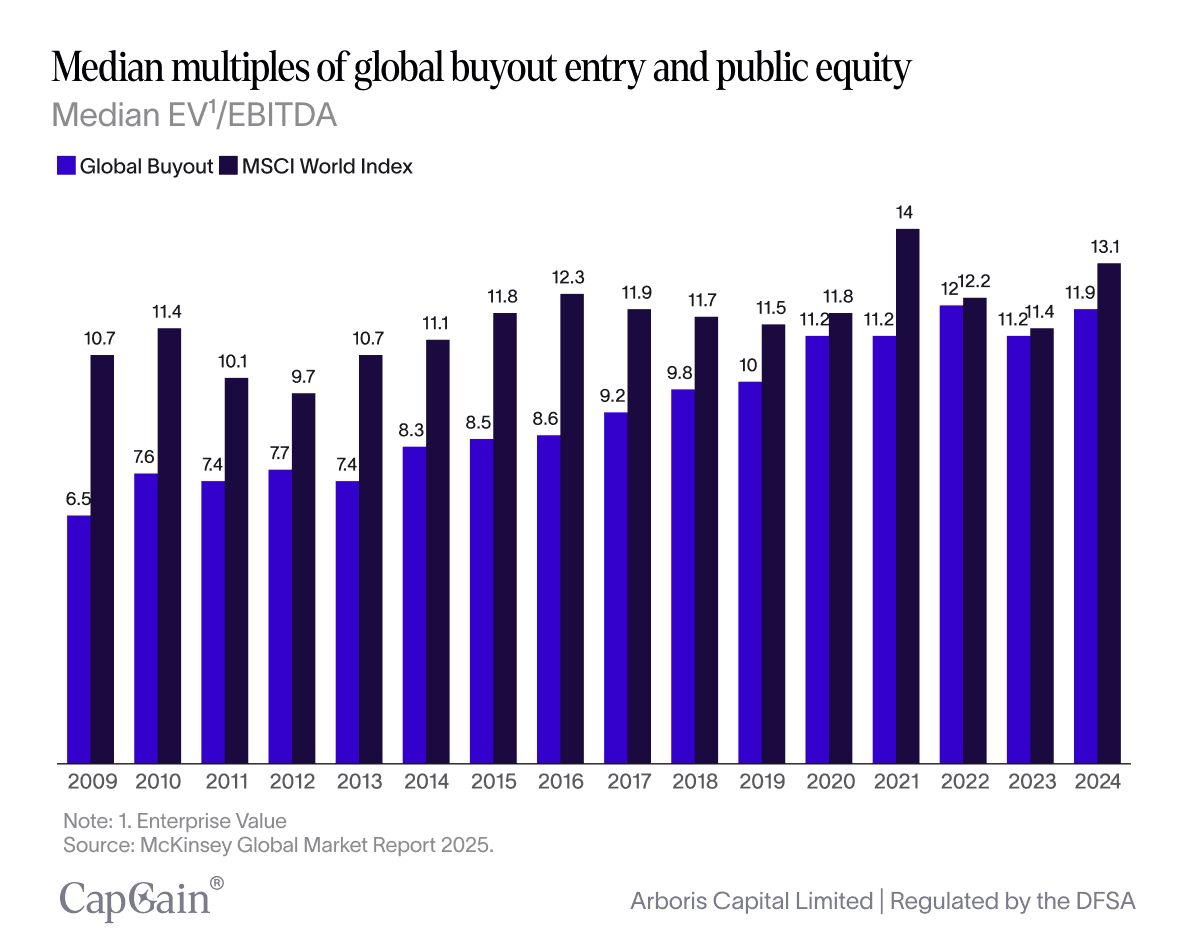 According to McKinsey Global Private Market Report 2025, private equity firms have consistently paid lower valuation multiples than public market investors over the past 15 years ((4. In 2024, that gap widened once again. The average global buyout multiple sat at 11.9x EBITDA, while the MSCI World Index climbed to 13.1x. That’s a full 1.2x spread—a meaningful divergence in pricing.