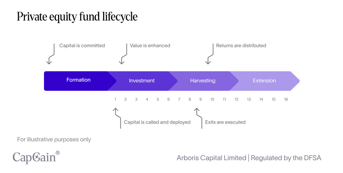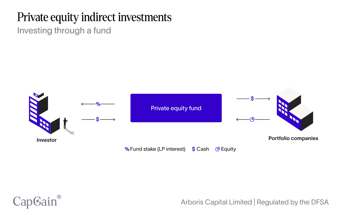Investors don't buy into companies directly; they commit capital to a fund, which then acquires and manages a portfolio of private companies